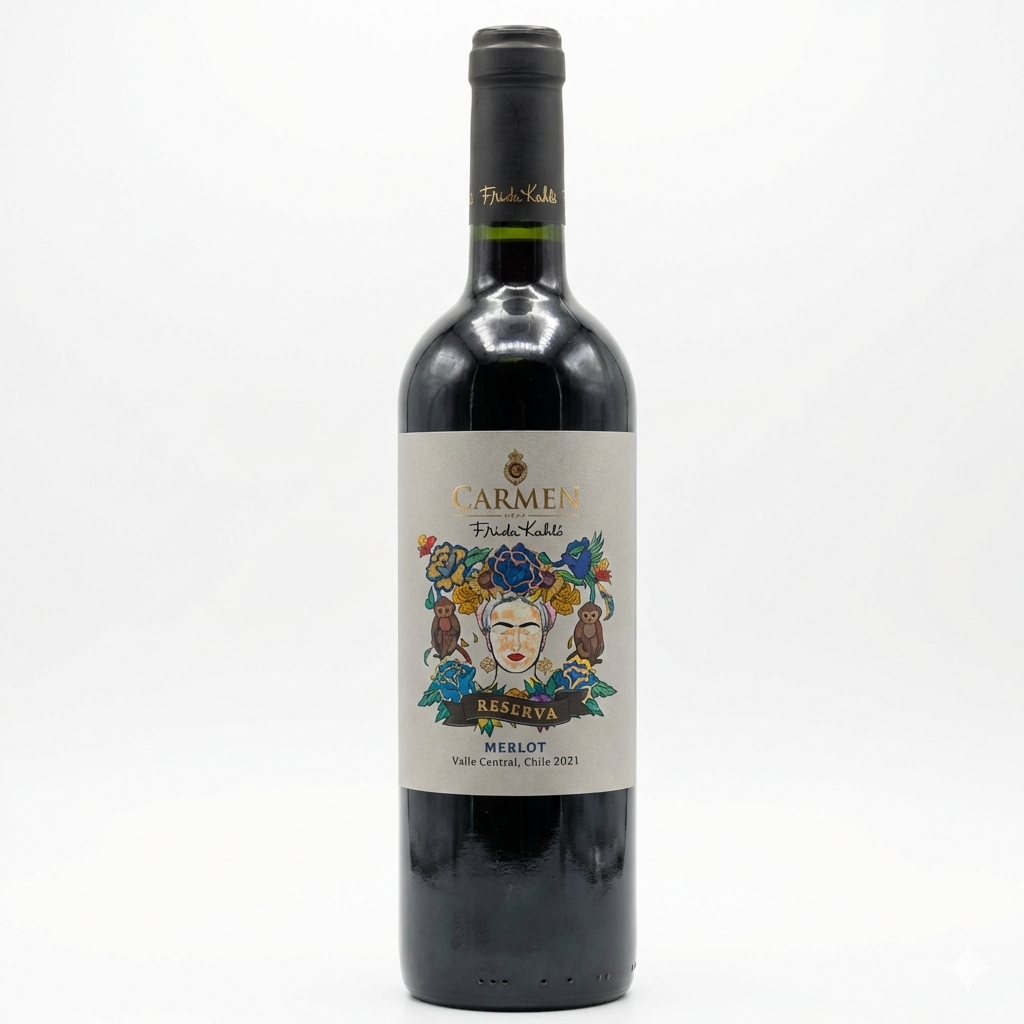 Carmen Frida Kahlo Merlot, um vinho que une a tradição da vinícola mais antiga do Chile à intensidade e ao legado de uma das maiores artistas do mundo. Este exemplar do Vale Central é uma homenagem à força, autenticidade e paixão de Frida Kahlo, refletidas tanto em seu rótulo artístico quanto em seu perfil sensorial envolvente.